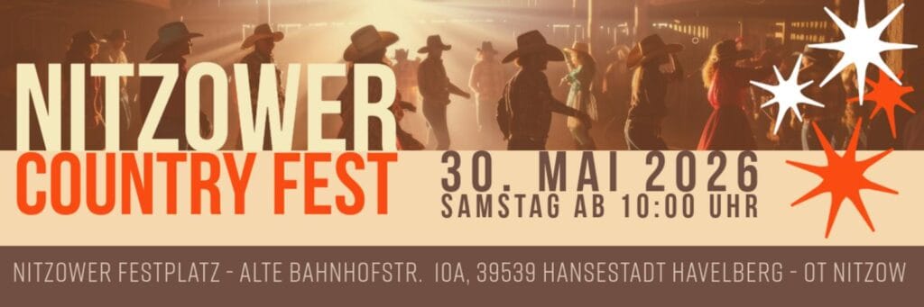 Am 30.Mai 2026 öffnet das CountryFest Nitzow zum dritten Mal die Saloontüren für einen Tag voller guter Laune, Live-Countrymusik, Line Dance, leckerem Essen und kühlen Drinks.