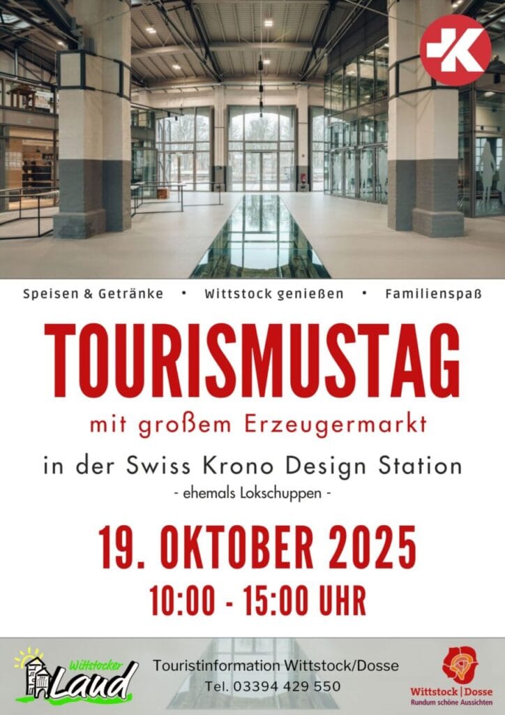 Von 10 bis 15 Uhr können Sie in der Swiss Krono Design Station, ehemals Lokschuppen, verschiedene touristische Angebote sowie eine große Vielfalt an regionalen Erzeugern aus unserer Region und dem benachbarten Mecklenburg-Vorpommern kennenlernen. Leckerer Kuchen, regionale Produkte und Ausflugziele für den nächsten Kurztrip warten darauf, direkt vor Ort probiert und entdeckt zu werden. Für unsere kleinen Gäste ist der Spaß mindestens durch die Hüpfburg vorprogrammiert.